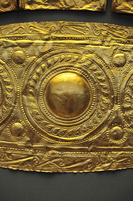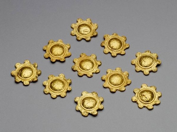 orecchini a cerchietto, placche d’oro con decorazioni a rilievo per ornare gli abiti.