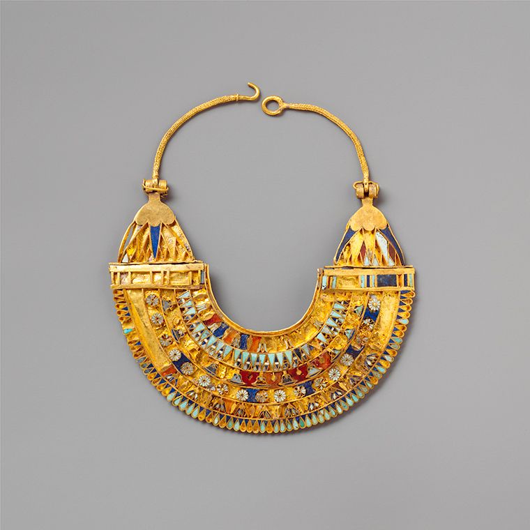 La società era composta da gerarchie dove al primo posto troviamo il faraone, i principi, sacerdoti architetti scribi etc… Ancora una volta come nelle altre civiltà le tombe e le decorazioni parietali ci assicurano la testimonianza dei metalli usati e i relativi gioielli prodotti (corredi funerari). Sappiamo che gli egizi lavoravano l’oro, ridotto in sottili lamine, battuto a sbalzo (a rovescio) e usavano la tecnica della granulazione. Tutta la loro gioielleria è fortemente simbolica poiché ogni animale assumeva un preciso significato. Il serpente era legato alla sovranità, lo indossava il faraone ( era riprodotto sul “Nemes” un copricapo)