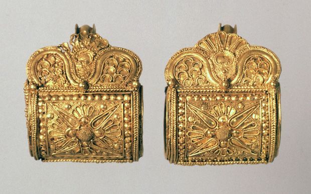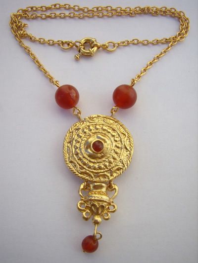 pendenti ovali, pettorali, chi più ne ha più ne metta… Si fa largo uso della granulazione (minuscole palline) e della filigrana che decorano i monili e oggetti vari. Pensate che ancora oggi è un mistero sulla realizzazione della granulazione, di come sia possibile creare le sferette cosi minuscole tutte uguali, un lavoro eccezionale che ha dell’incredibile. Le collane erano create usando anche pietre dure.