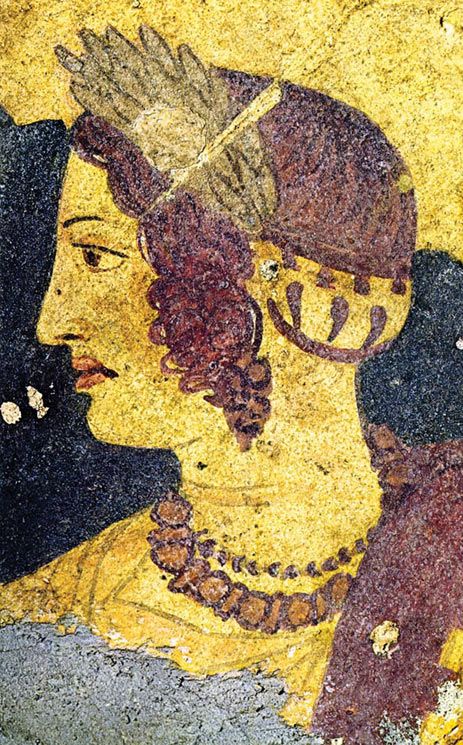 Ha dato l’inizio a quella che poi sarà la cultura e vita romana con i grandi imperatori che noi tutti conosciamo. Essenziale per la crescita di Roma che finì per “assorbire” i vicini di casa con la caduta di Veio nel 396 A.C. (III secolo circa). Gli etruschi erano un popolo stabilitosi nell’area a nord del Lazio e tra il fiume Arno e il Tevere, la cosiddetta Etruria, (i primi nuclei proto urbani risalgono al IX secolo A.C.) Ma si espansero anche in Umbria, Campania e a nord toccando il Veneto. Sappiamo che intorno all’VIII secolo A.C. (la seconda metà) l’oro circola nel Lazio e in Etruria. Le città più conosciute erano Tarquinia, Veio, Populonia, Caere,(Cerveteri) Vetulonia. Soprattutto a Tarquinia l’oro insieme al bronzo viene usato per produrre oggetti a uso personale come le fibule. Ma che cosa indossavano gli Etruschi? Bisogna ricordare che la società era formata da un’aristocrazia e classi sociali inferiori e questo divario era molto marcato a quell’epoca. Testimonianza dei gioielli ce la forniscono numerose tombe dove erano accumulate le ricchezze. La tomba custodisce i defunti che indossano ricchi ornamenti, soprattutto le donne (che in questa civiltà potevano partecipare alla vita assumendo ruoli di rilievo nel mondo del lavoro e del commercio ed essere emancipate al contrario della cultura greca e romana). In uno spazio riservato della tomba stessa vi erano vasi d’oro e d’argento avori, oggetti bronzei. Anche attraverso gli affreschi possiamo risalire ai gioielli indossati. Con il passare del tempo affiorarono temi e tecniche orafe sempre più sofisticate e a volte si usavano soggetti orientali, come le palme. Quindi largo uso di fibule(spille) ad arco o sanguisuga che potevano essere d’oro, di argento o bronzo.